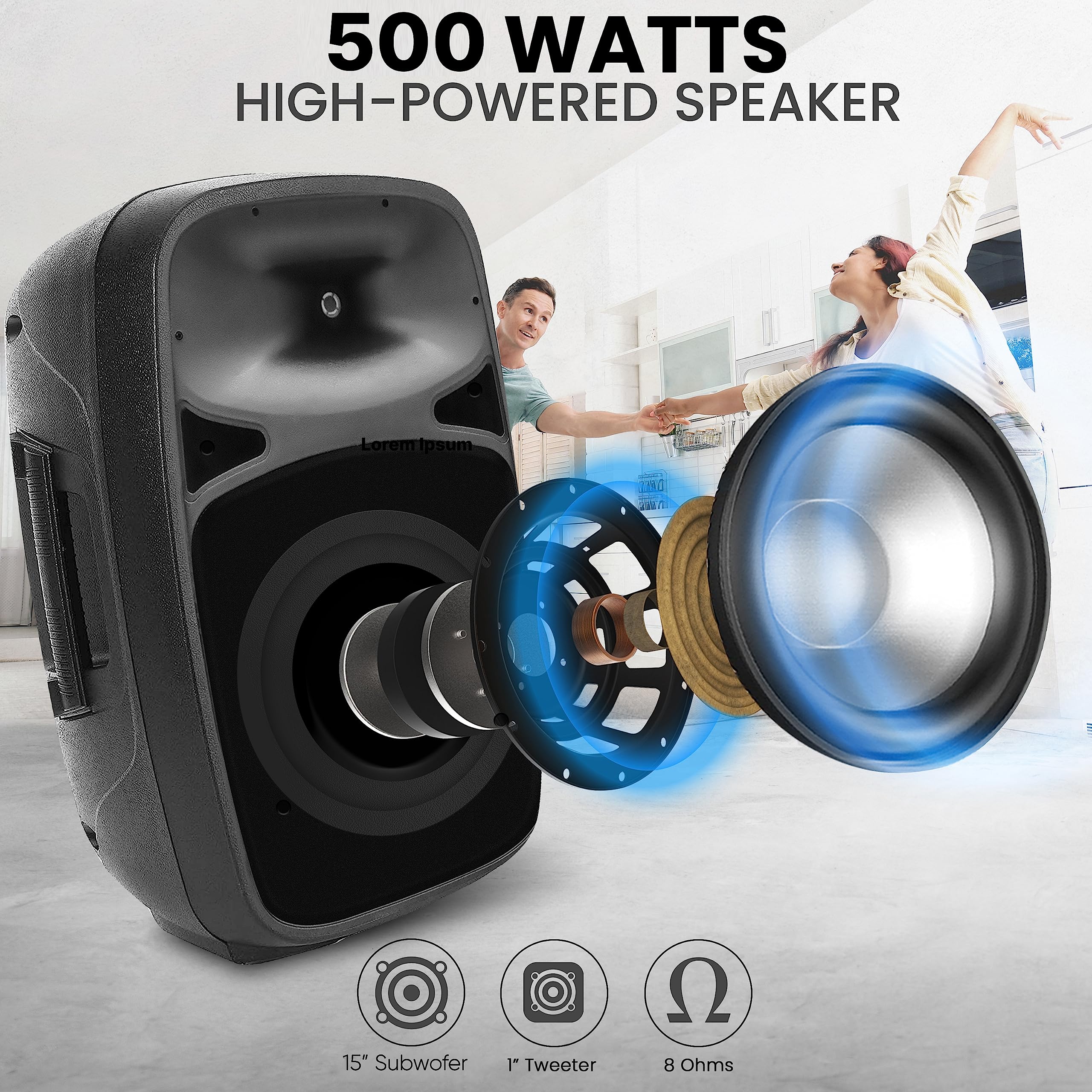 - 500 WATTS MAX POWER - The PA combo speaker system features a 2x15” woofer and 2x1” tweeter, providing a 500W max power output. Enjoy full-range surround stereo sound with deep bass and clear highs, perfect for indoor and outdoor events